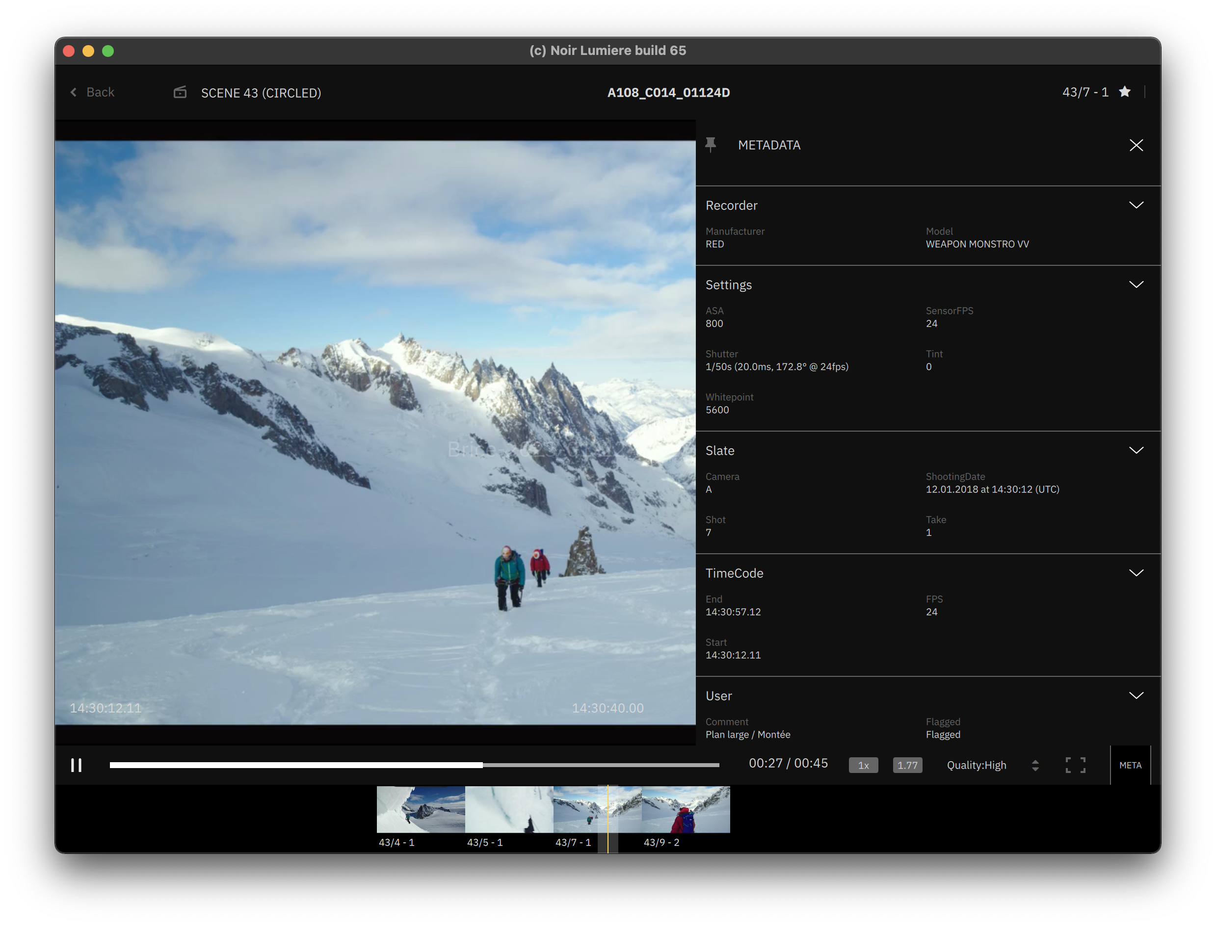 Cette année, nous avons aussi le plaisir de vous présenter quelques nouveautés comme l’affichage des métadonnées, liées à chacun des clips (focales, température de couleur ou encore les commentaires). La gestion de ces métadonnées est réalisée par l’application "Manager", qui permet d’attribuer, pour chaque utilisateur, les informations à consulter. Le cas échéant, il est aussi possible d’en masquer si certaines s’avéraient sensibles ou inutiles.