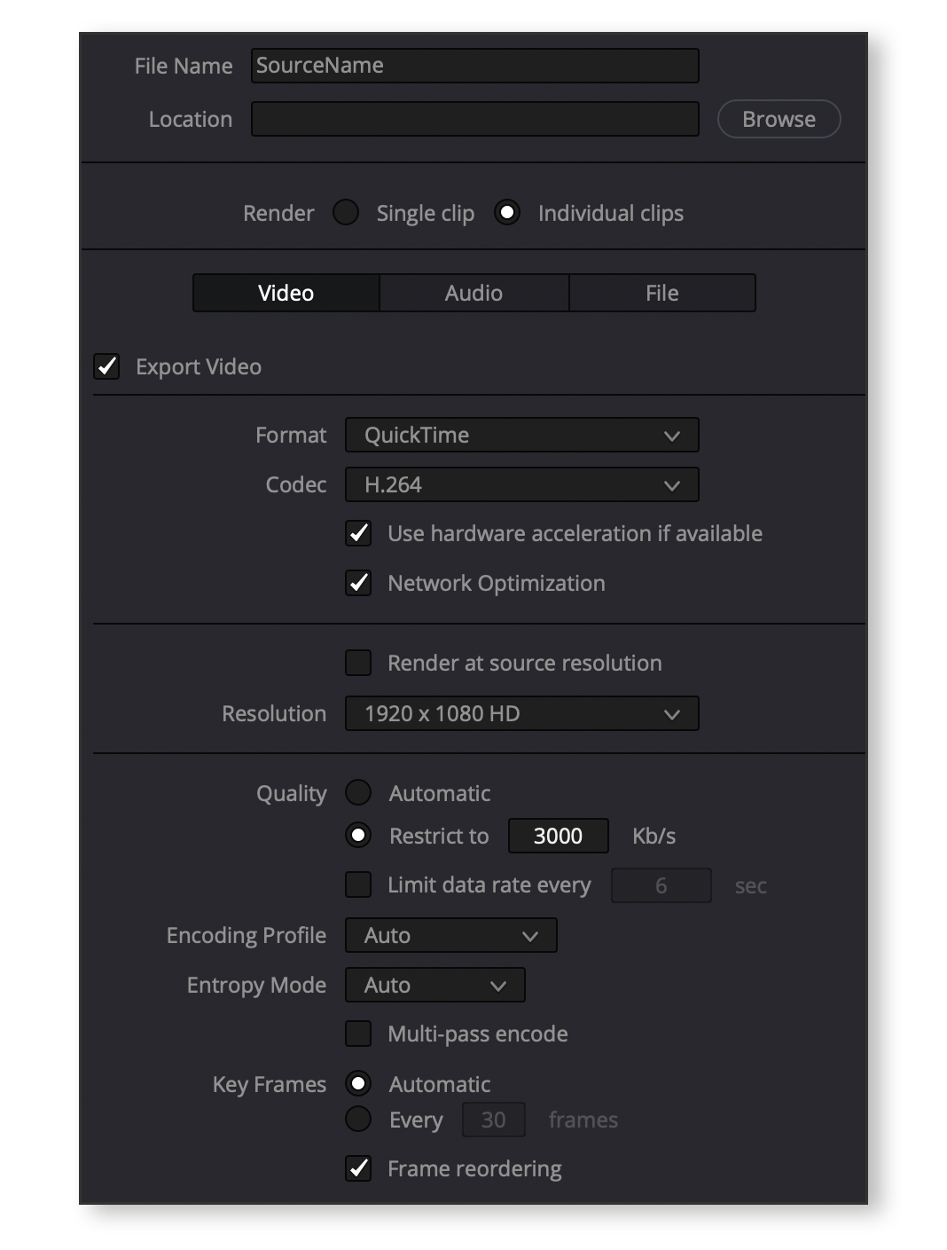 For RED cameras, please select "embedding in source clip file" instead. If you choose source clip filename, you will get a "_001" suffix that will prevent you from linking to your video files in Dailycious. This is a common mistake that new users often make.
